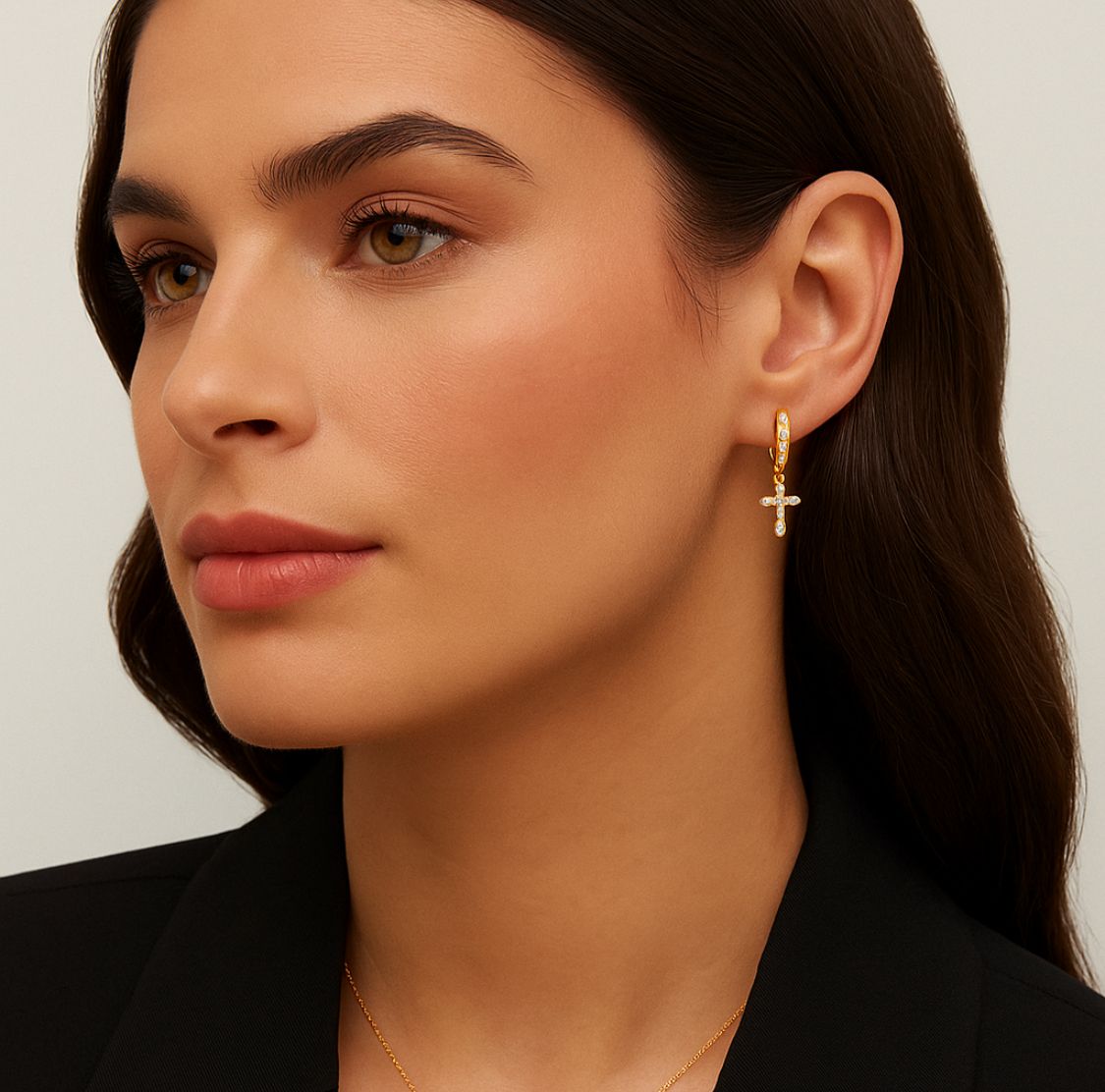 Fé e brilho em cada detalhe! Essa argola com pingente de cruz é delicada e cheia de significado. Com banho em ouro amarelo e cravejada com zircônias que refletem a luz de forma encantadora, é uma joia que une estilo e simbolismo.