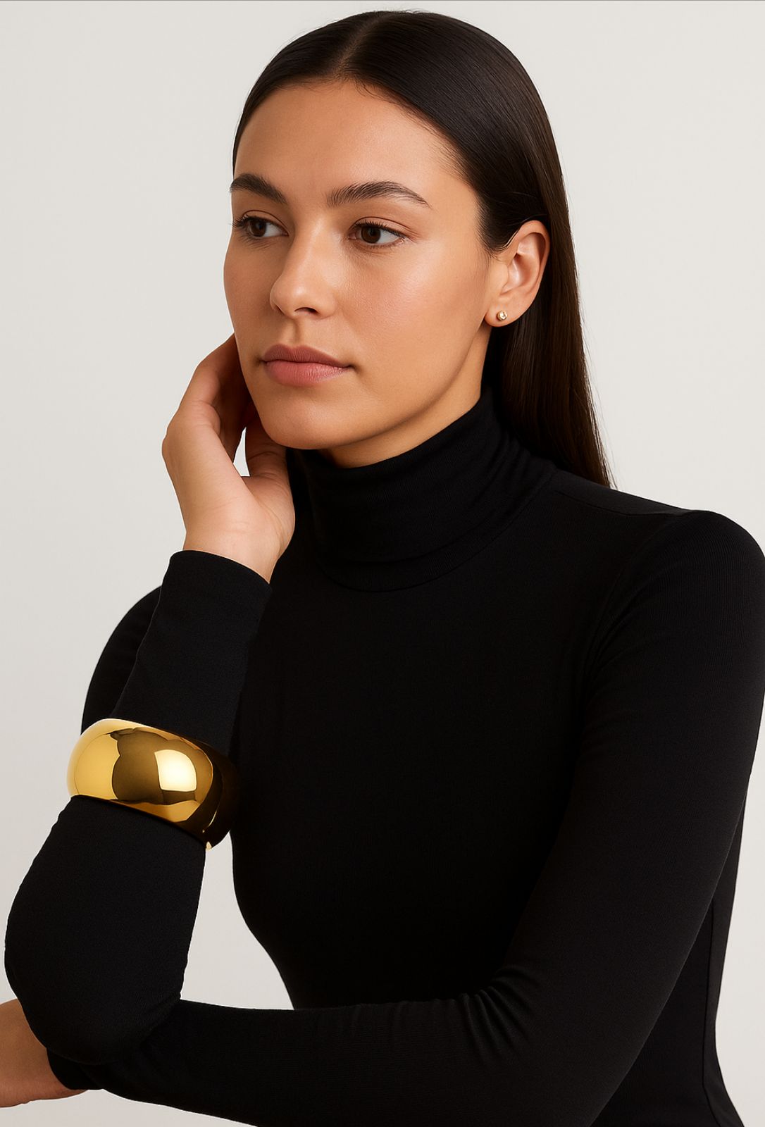Poder e sofisticação no seu look! Esse bracelete largo no banho ouro amarelo é a peça perfeita para quem quer se destacar com muito estilo. Seu design imponente, aliado ao brilho intenso do acabamento polido, cria um visual moderno e luxuoso que transforma qualquer produção.
