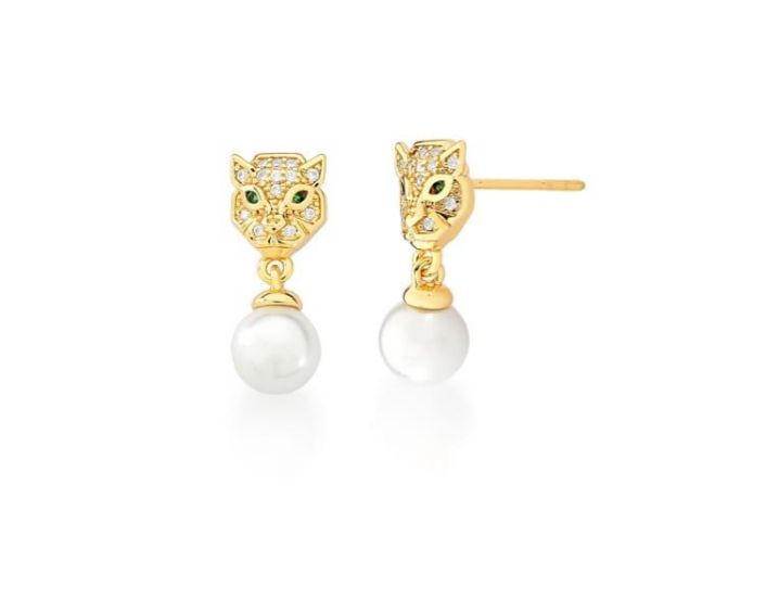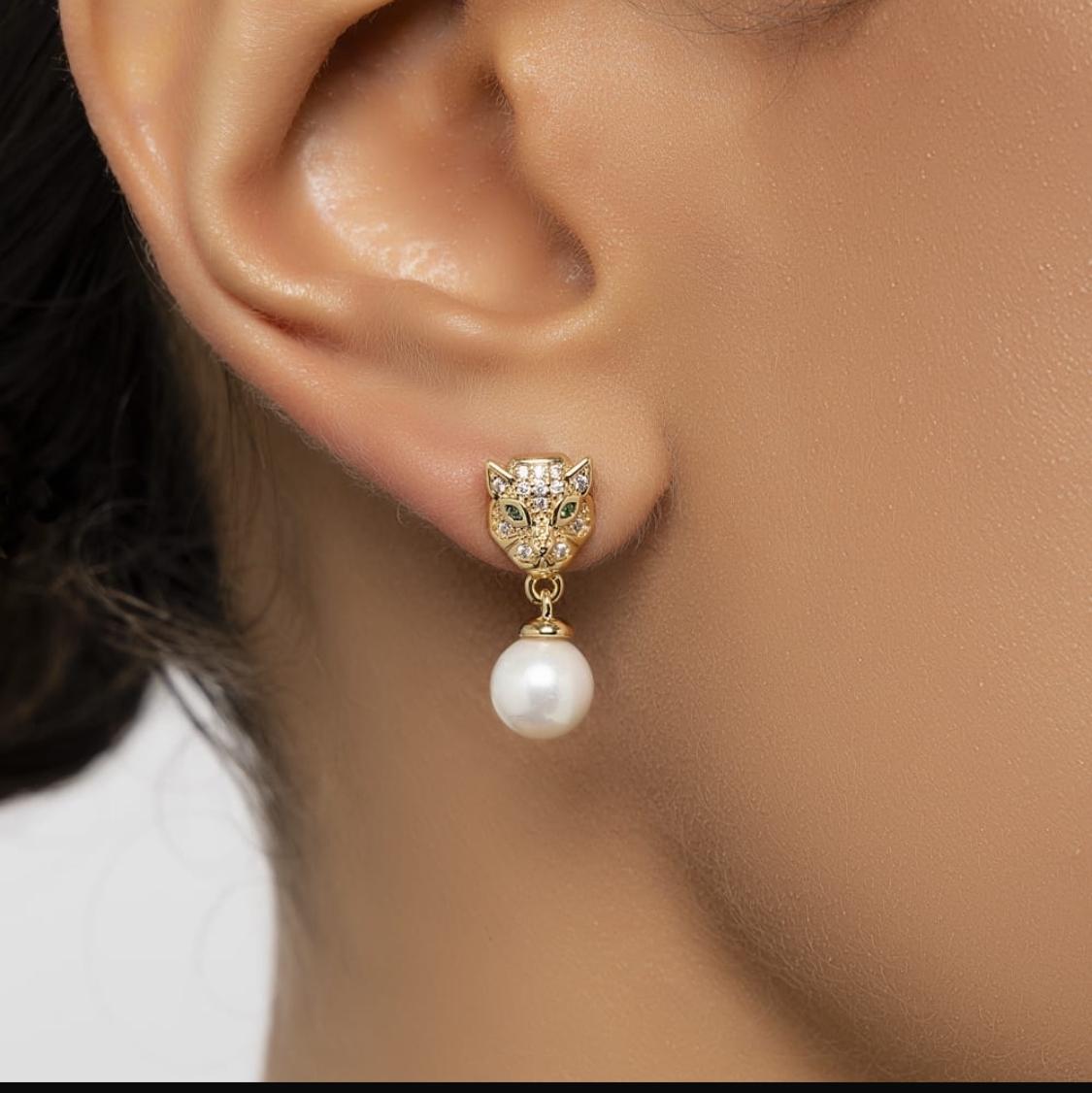 BRINCO DE PANTERA COM PEROLA – BANHO OURO AMARELO