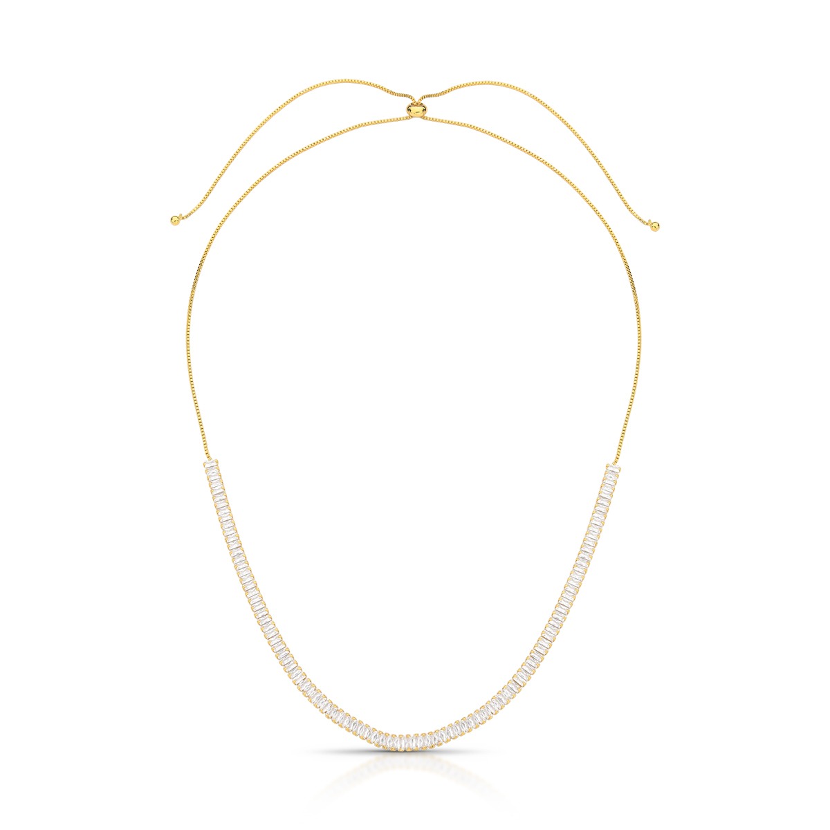 Choker Riviera moderna e ajustável, perfeita para quem busca elegância com praticidade. O fecho em estilo chambala permite regulagem do comprimento, garantindo conforto e versatilidade no uso. Por não possuir fecho tradicional, a peça é colocada passando pela cabeça e ajustada ao pescoço conforme desejado. O design é composto por zircônias em lapidação baguete, que proporcionam brilho sofisticado e visual contemporâneo. Ideal para compor looks do dia a dia ou ocasiões especiais com um toque de glamour.