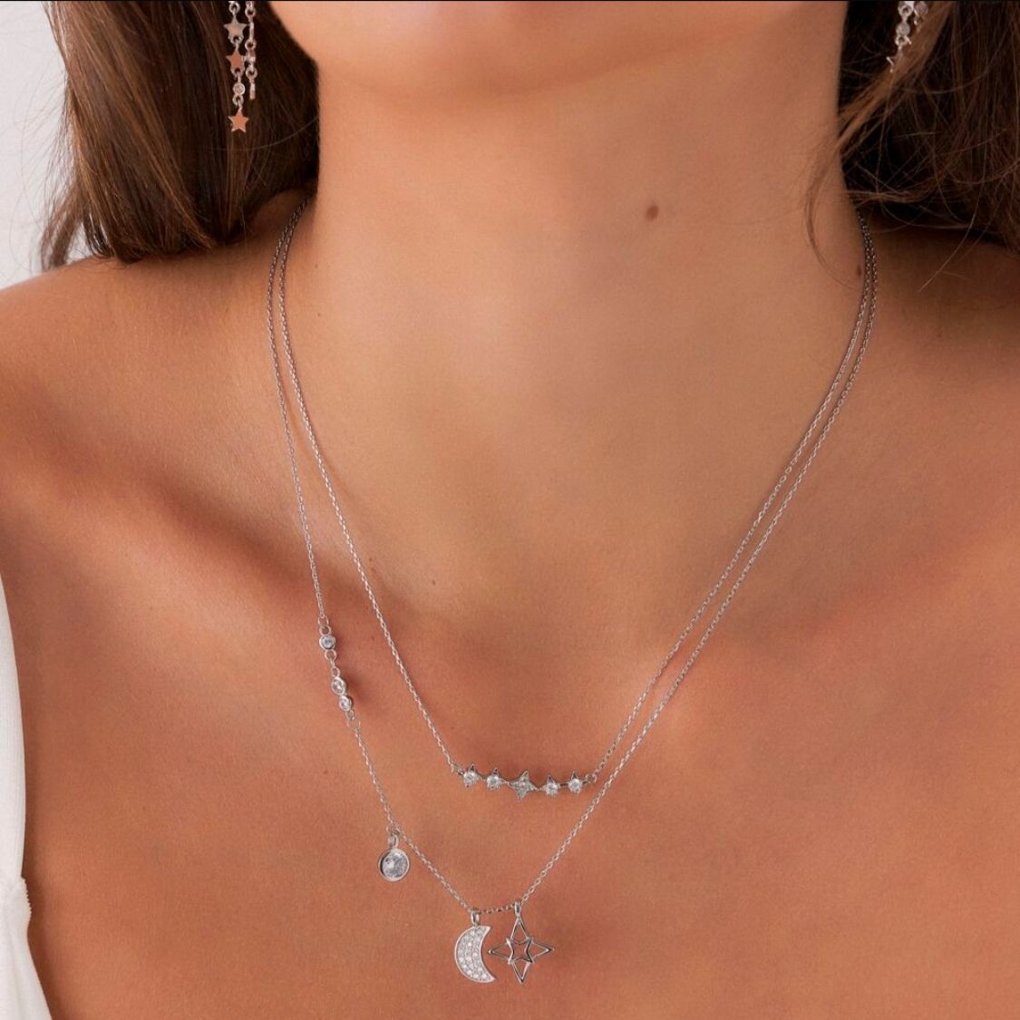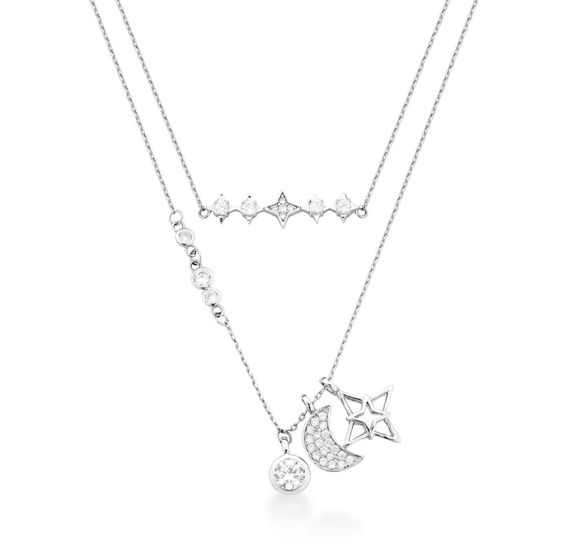 Colar Duplo Estrelas e Lua – Banho de Ródio Branco