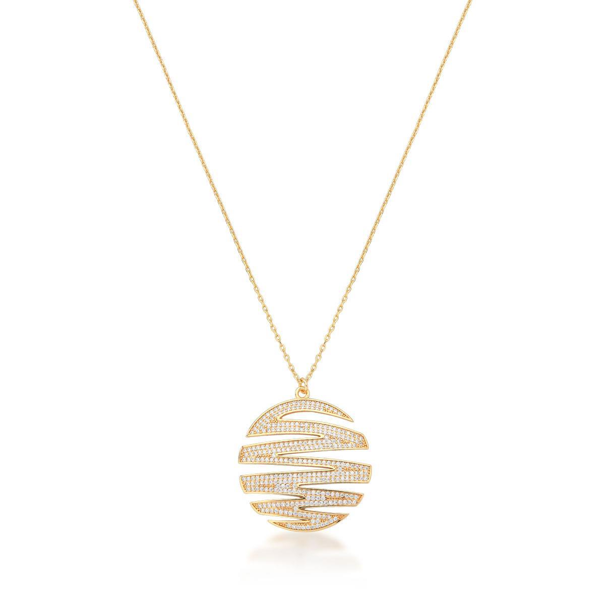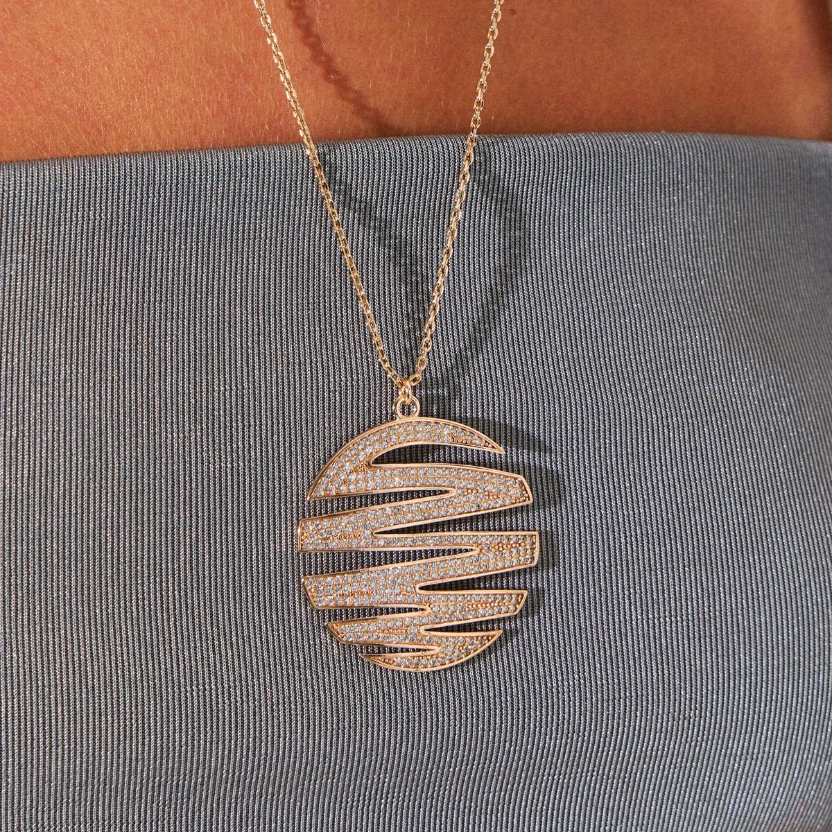 O destaque fica para o pingente redondo vazado, com design fluido que lembra ondas ou movimentos de energia. As faixas curvas são cravejadas com zircônias brilhantes, que refletem a luz com intensidade e dão um toque de luxo sutil.