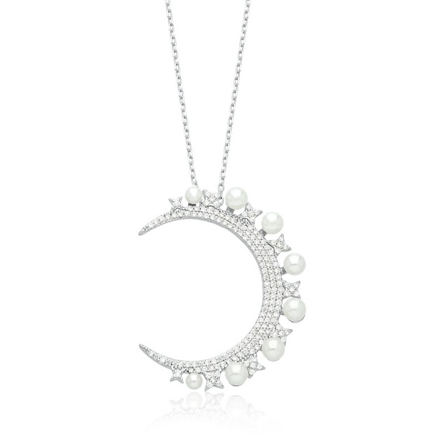 Corrente delicada estilo Cartier com banho de ródio branco, acompanhada de um pingente grande em formato de meia-lua, símbolo de feminilidade, renovação e intuição. O pingente é ricamente detalhado com mini flores, pérolas baby e zircônias que adicionam brilho e romantismo à peça.