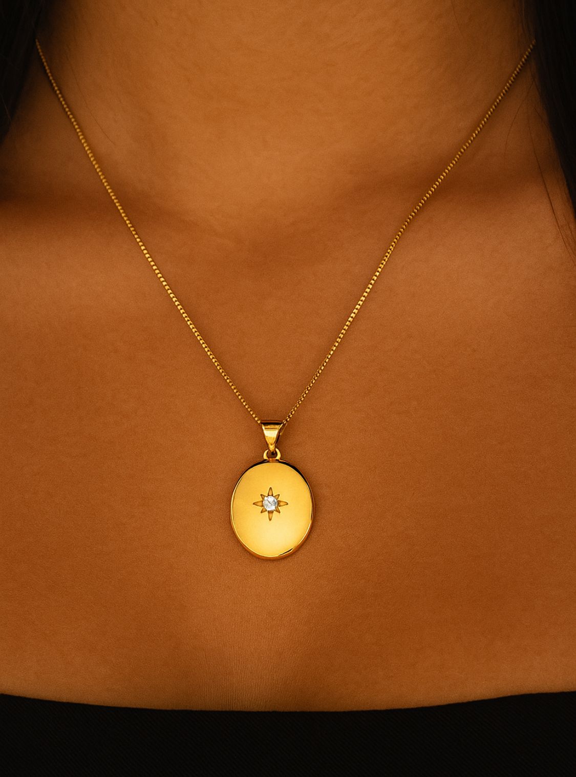 Corrente delicada em malha veneziana acompanhada de um pingente oval de tamanho médio, com design refinado e simbólico. No centro do pingente, uma zircônia brilhante é posicionada dentro de uma estrela delicadamente esculpida, remetendo à luz, brilho e inspiração. Uma peça que carrega elegância, significado e um toque de exclusividade. Ideal para compor looks sofisticados ou para presentear com estilo e bom gosto. Banho em ouro amarelo e acabamento polido garantem brilho duradouro.