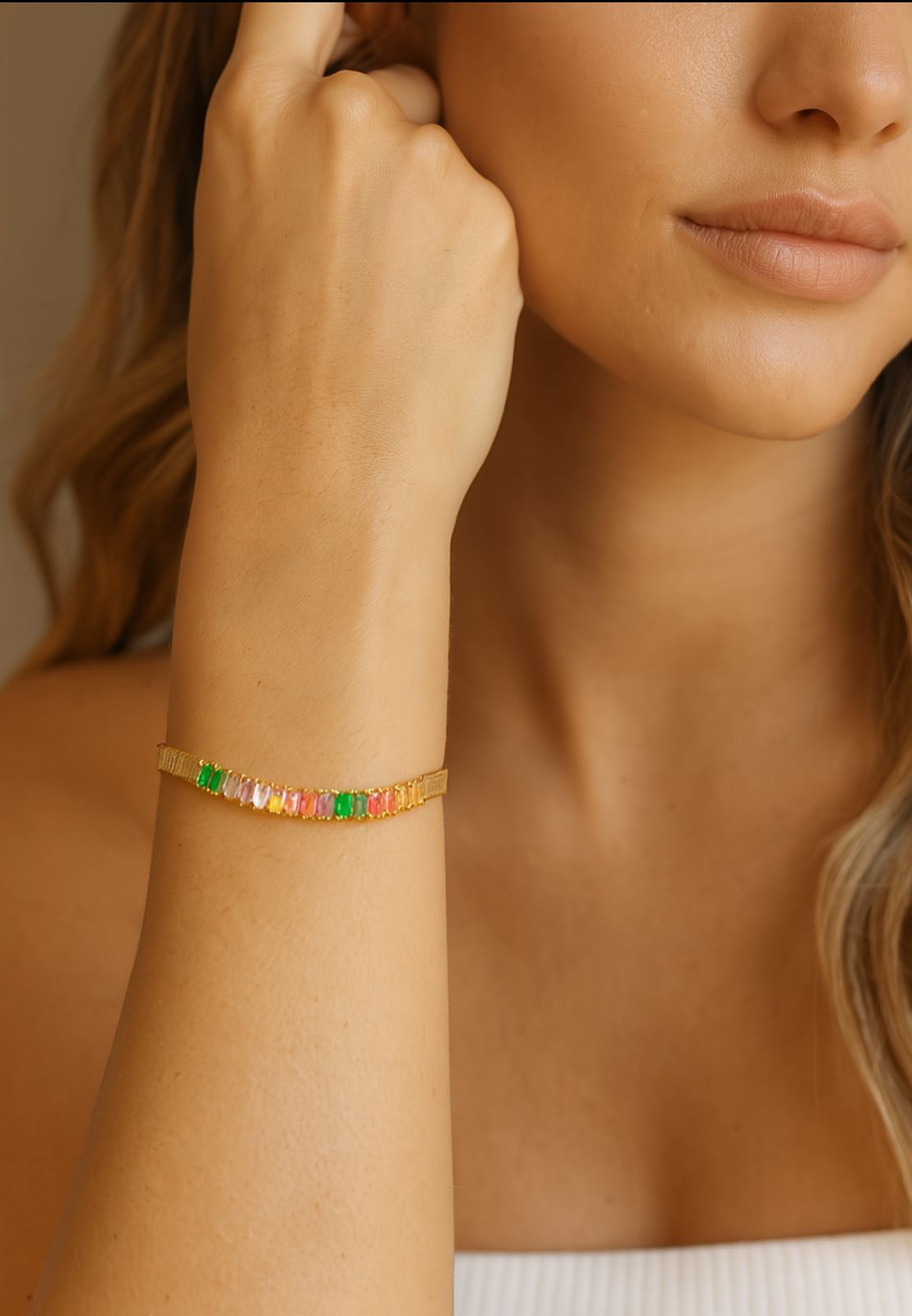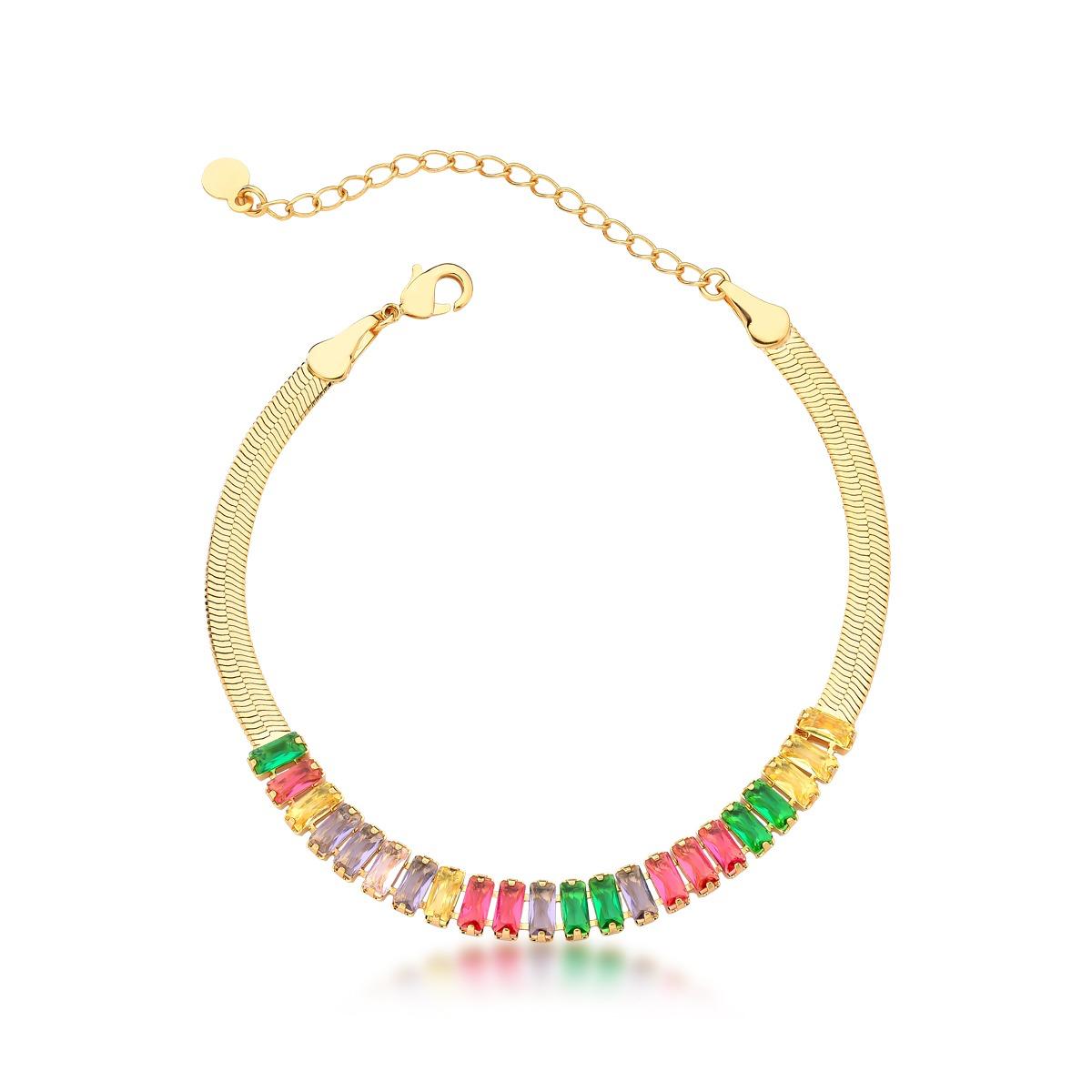 O destaque fica por conta do centro da peça, onde várias pedras coloridas com corte baguete são cuidadosamente cravadas, criando um visual moderno, alegre e sofisticado. O fecho lagosta completa a pulseira com praticidade e segurança.